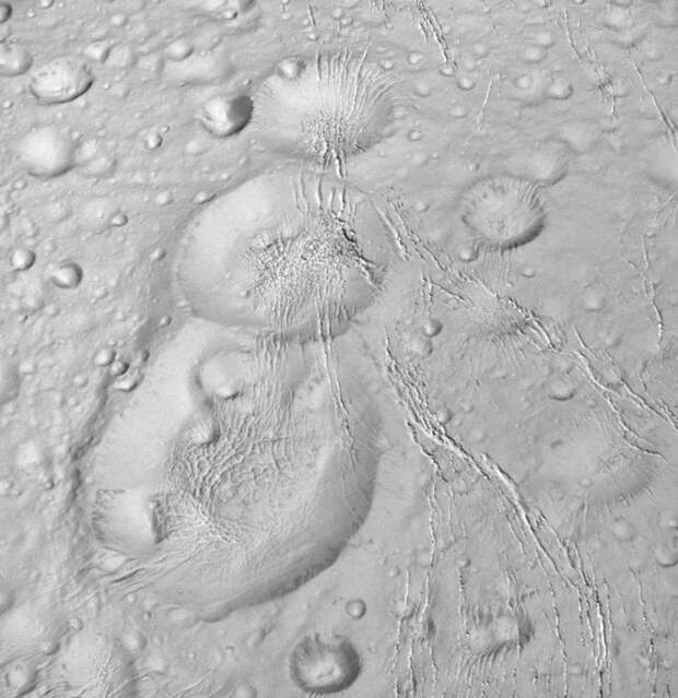 Станция Cassini нашла на спутнике Сатурна Энцеладе снеговик, который формируют три кратера. Снимки получены 14 октября 2015 года, когда аппарат находился на расстоянии 1839 километров от поверхности. (Фото Nasa | JPL-Caltech | Space Science Institute):