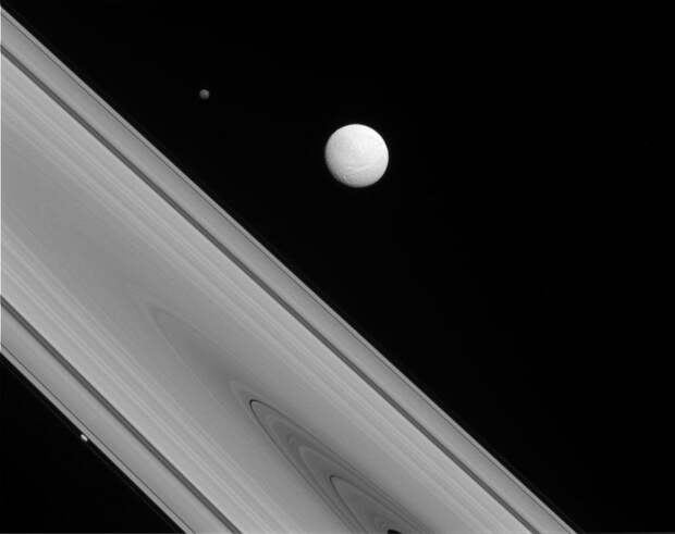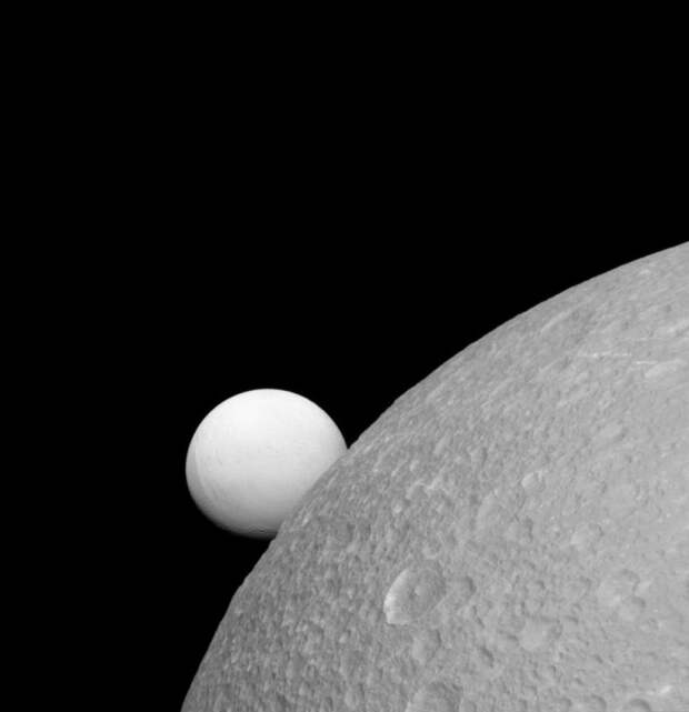 Два спутника Сатурна — Диона (рядом) и Энцелад (дальше). Диона состоит преимущественно из водяного льда со значительной примесью каменных пород во внутренних слоях. (Фото Nasa | JPL-Caltech | Space Science Institute):